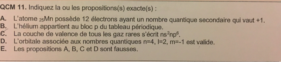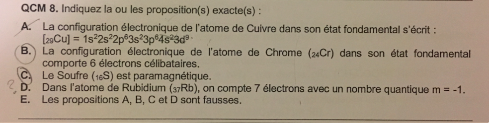 Sujet n°1 : Dans l’item D du QCM 8 on compte seulement 2 électrons lorsque l’OA est totalement remplie tandis que pour l’item A du QCM 11 on compte la totalité des électrons contenus dans l’OA. Pourquoi?