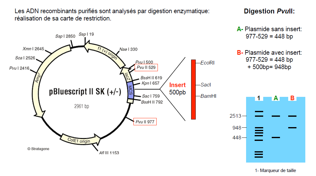 Expliquez rapidement quel est le rôle d'une carte de restriction et de quels éléments elle se compose avant de détailler la méthodologie pour la résoudre en vous appuyant sur l'exemple ci-dessous: vecteur de 2961 pb, insert de 500 pb, digestion par PvuII. Vous préciserez brièvement le lien entre le schéma de la carte de restriction et les résultats du gel d'électrophorèse.