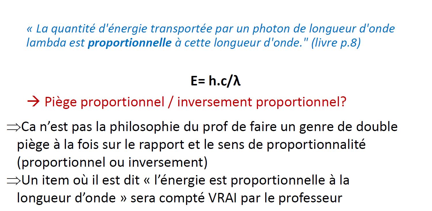 Ca me dérange un peu dans le sens ou E=hc/λ, et donc que E est inversement proportionnelle à λ, faut-il retenir les deux versions et les compter vraies le jour du concours ? J'ai l'impression que le prof ne fait pas de distinctions entre depend de et proportionnelle