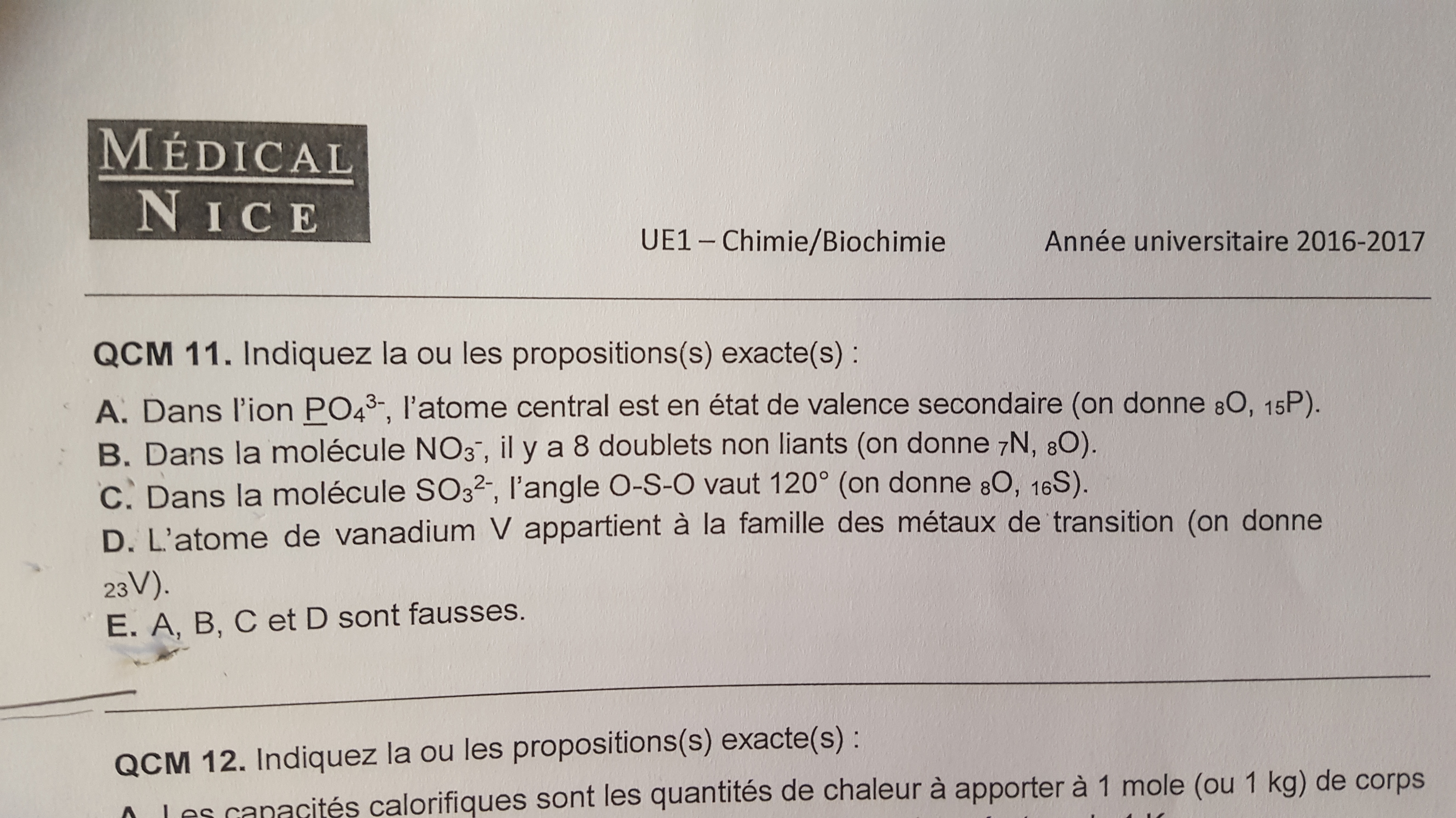 Pour l'item C: Encore une fois il y a une histoire de mésomérie mais que tu mette les charges - sur le soufre ou les oxygènes tu aura une molécule de type AX3E, donc pas de soucis pour déterminer l'angle et répondre à l'item