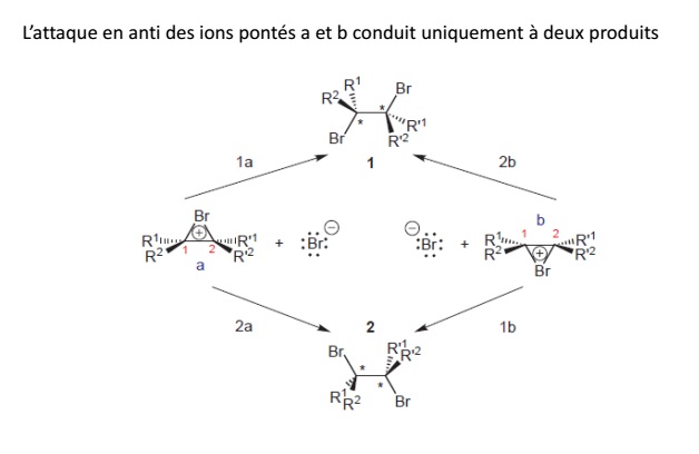 Ensuite pourquoi cette même réaction est-elle stéréospécifique? On a deux produits et je n’ai pas compris l’explication dans la Ronéo de l’an dernier.