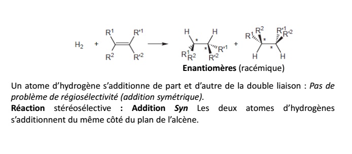 En fait ici c'est la même histoire que pour la dihalogénation : l'addition des H se fait en SYN (contraire d'en anti) donc on aboutit à 2 molécules sur les 4 potentielles (encore une fois, on ne crée que les énantiomères et pas les diastéréo ;) )