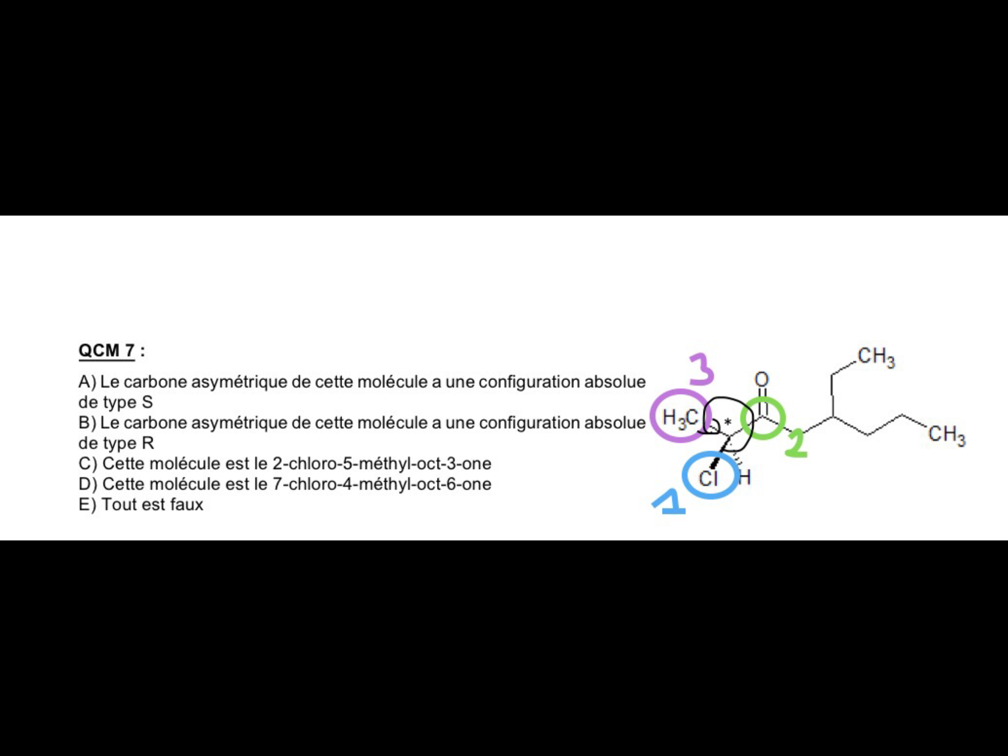 En somme on a donc 1->Cl 2->C(vert) 3->C(violet), donc tu tourne dans le sens inverse des aiguilles d'une montre, et comme le groupement 1 est dans le plan tu ne changes pas ce que tu trouves, donc ici on a bien une configuration S.