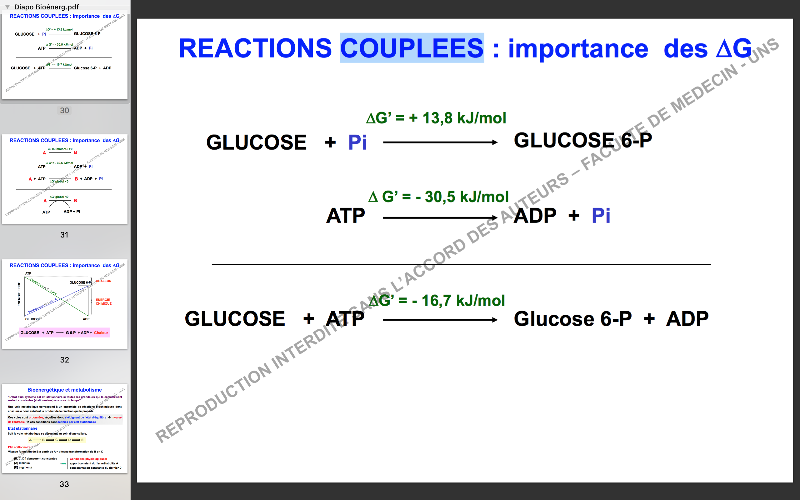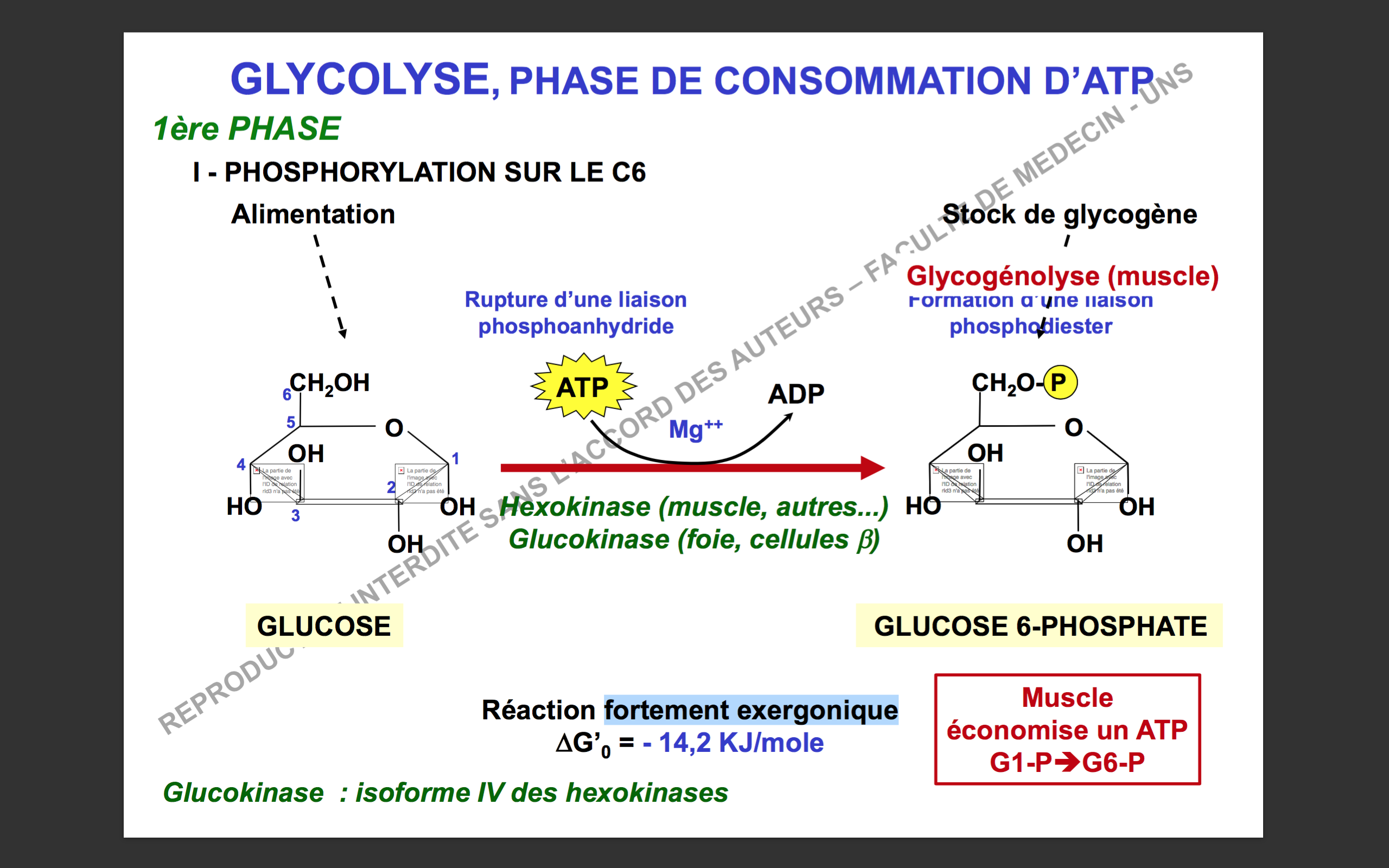 :arrow: Or dans le cours de bioénergétique de cette année le prof détaille la réaction Glucose --> Glucose 6P (=Réaction 1 GL) en tant que couplage énergétique grâce à l'hydrolyse de l'ATP.