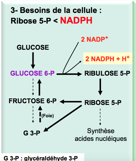 Dans la ronéo 11 il est dit que lorsque la cellule a un besoin plus élevé en NADPH qu'en ribose-5P ce dernier retournera vers la glycolyse afin de remonter les réactions et redonner du G6P mais c'est un peu un abus de language non ? Enfin ça me semble faux de dire qu'on se serve de la glycolyse indirectement en gros dans ce cas là et pas plutôt de NGG