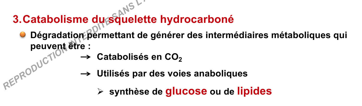 "Dégradation permettant de générer des intermédiaires métaboliques qui peuvent être : catabolisés en O2 CO2 cf diapo 49. Même diapo la prof parle de synthèse de glucose et lipide vs glucose et cc dans la ronéo: cc = lipides ?