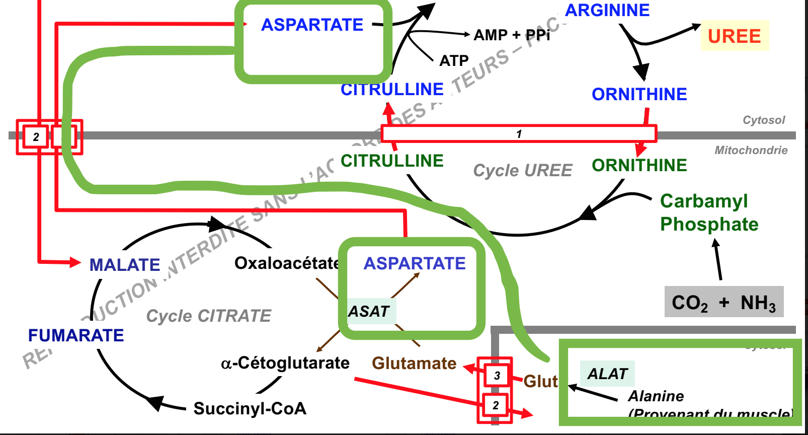 J'ai un petit soucis en ce qui concerne l'origine de l'aspartate dans le cycle de l'urée. On nous dis que cet aspartate provient de l'alanine (du muscle donc) et qu'il a été préalablement transformé en glutamate. Mais dans un autre schéma de la prof, on voit que l'aspartate provient d'une transamination entre un glutamate et un oaa du cycle de Krebs. Dans ce cas, comment notre xorps fait pour faire la différence entre un glutamate provenant d'une alanine d'un glutamate provenant d'une glutamine ?