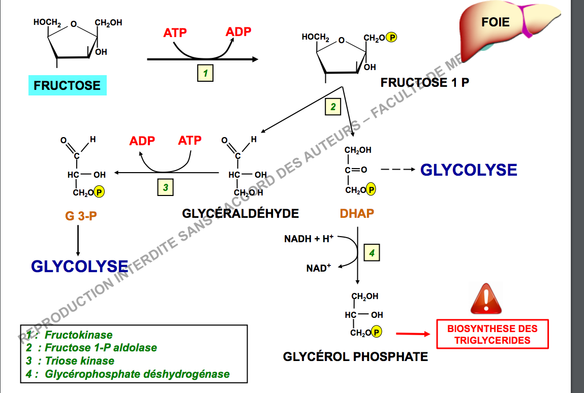 Petite question par rapport a la page 3 de la ronéo 10, dans la diapo en haut de la page y a écrit qu'on utilise la GlucoKinase pour passer de fructose a DHAP + G3P. Alors qu'a la page suivante on précise bien que la GK est spécifique au glucose et surtout pas au fructose, d'ou l'utilisation de la FructoKinase