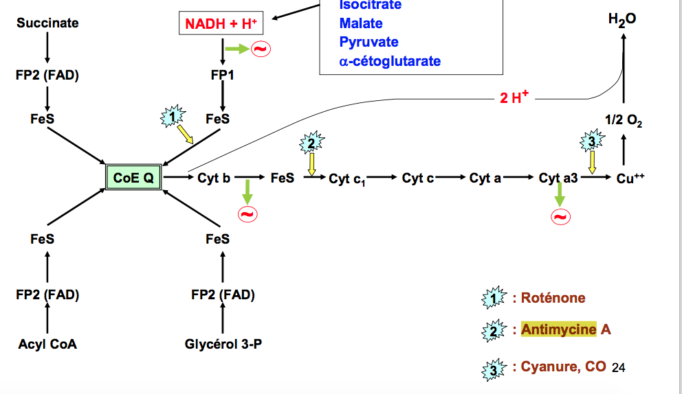 Parce que si on prend l'exemple de l'Antimycine qui inhibe le complexe III, le cytochrome C aura pas reçu ses electrons ducoup il sera sous forme oxyde non? Et aussi le FMNH2 aura libère les électrons et les protons au coenzyme Q ducoup il sera de nouveau oxyde sous forme FMN de même pour NADH+H+ (vu que c'est le but de la phosphorylation oxydative, s'oxyder les coenzymes réduits par le métabolisme..) ?