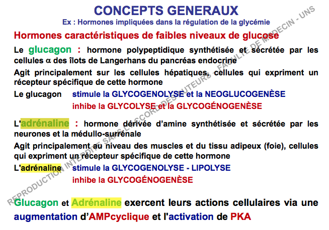 L'adrénaline n'inhibera pas la GL car elle agit au niveau du muscle: or au niveau musculaire, il n'y aura jamais d'inhibition complète de la GL car elle est nécessaire à l'apporte en ATP. De même, elle ne peut pas agir sur la NGG car le foie passe via le glucagon