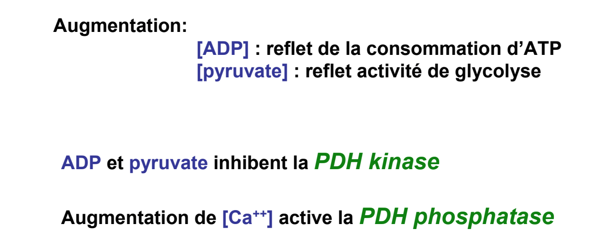 J'ai bien compris qu'il fallait distinguer les régulations, donc que le Ca2+ agit sur la PDH phosphatase mais qu'on ne peut pas dire qu'elle agit sur la PDH kinase, par contre pour le pyruvate, il agit bien sur la PDH phosphatase ET la kinase? Et les concentrations en NAD ATP?