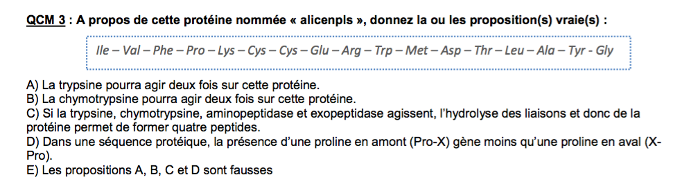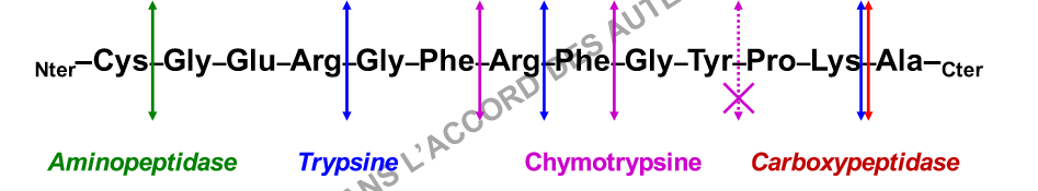La chymotrypsine (qui est une endoprotéase) ne peut agir que sur les acides aminés WYF donc sur cette protéine, elle pourra agir qu'au niveau de la thréonine et ne pourra pas agir au niveau du phénylalanie car il y a la présence d'une proline en aval et ne peut pas agir sur la tyrosine car normalement ce serait le rôle d'une exopeptidase (Carboxypeptidase) non ? Donc la chymotrypsine ici ne peut agir qu'une seule fois.