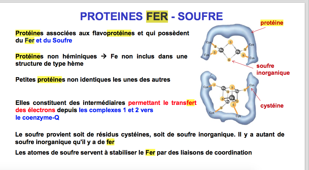 L'année dernière la prof disait que le souffre des protéines Fe-s était constitué par la partie organique = celui des cystéines , non rattachés au fer , ET du <souffre Inorganique , lui même relié au fer , et que donc ce souffre inorganique stabilise le Fer par coordination. Du coup ça a changé cette année ?
