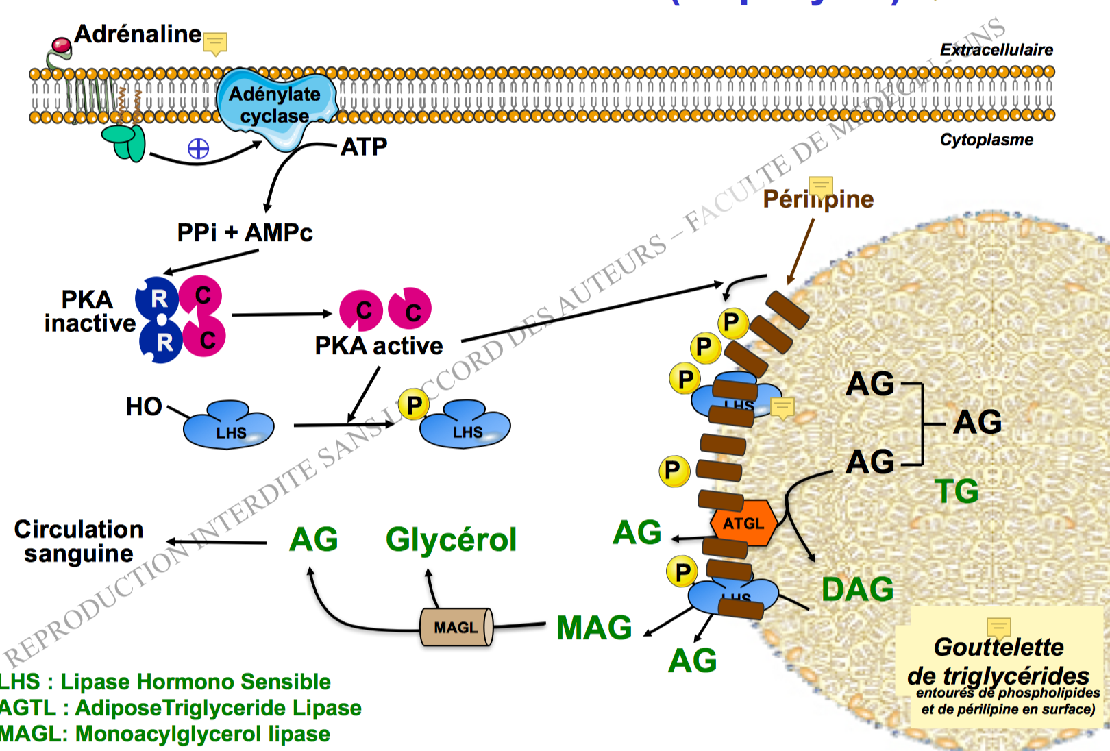 "La lipolyse en intracellulaire se fait en présence de glucagon/adrénaline et permet de libérer AGNE transportés par l'albumine et un glycérol qui ira directement au niveau du foie pour s'engager dans la voix de la NGG"