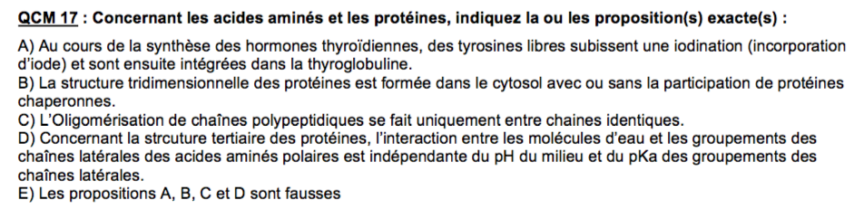 Bonsoir ! Je ne suis pas d'accord avec la correction d'un item du CC de l'an passé (C'est l'item A de la photo) car de ce que j'ai compris dans le cours, c'est la thyroglobuline qui permet la production des hormones thyroïdiennes, grâce à la coupure enzymatique de la protéine, donc vu comme c'est formuler, moi je comprends le contraire et je dirais que c'est faux, non ?