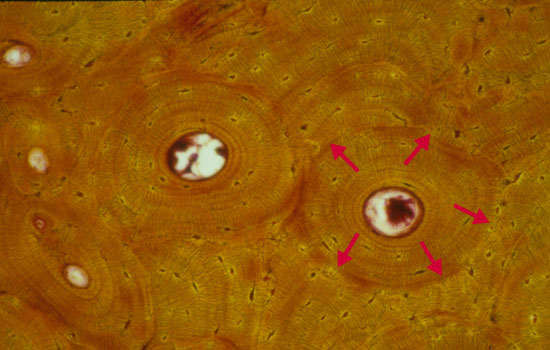 Sur cette coupe tu vois 5 beaux ostéons avec le canal de Havers au milieu. Et autour, entre les cercles qu'ils forment, c'est le tissu interstitiel, donc d'anciens ostéons qui ont été partiellement dégradés, d'ailleurs si tu regardes bien on voit que c'est super ressemblant aux ostéons, ça fait des lamelles !