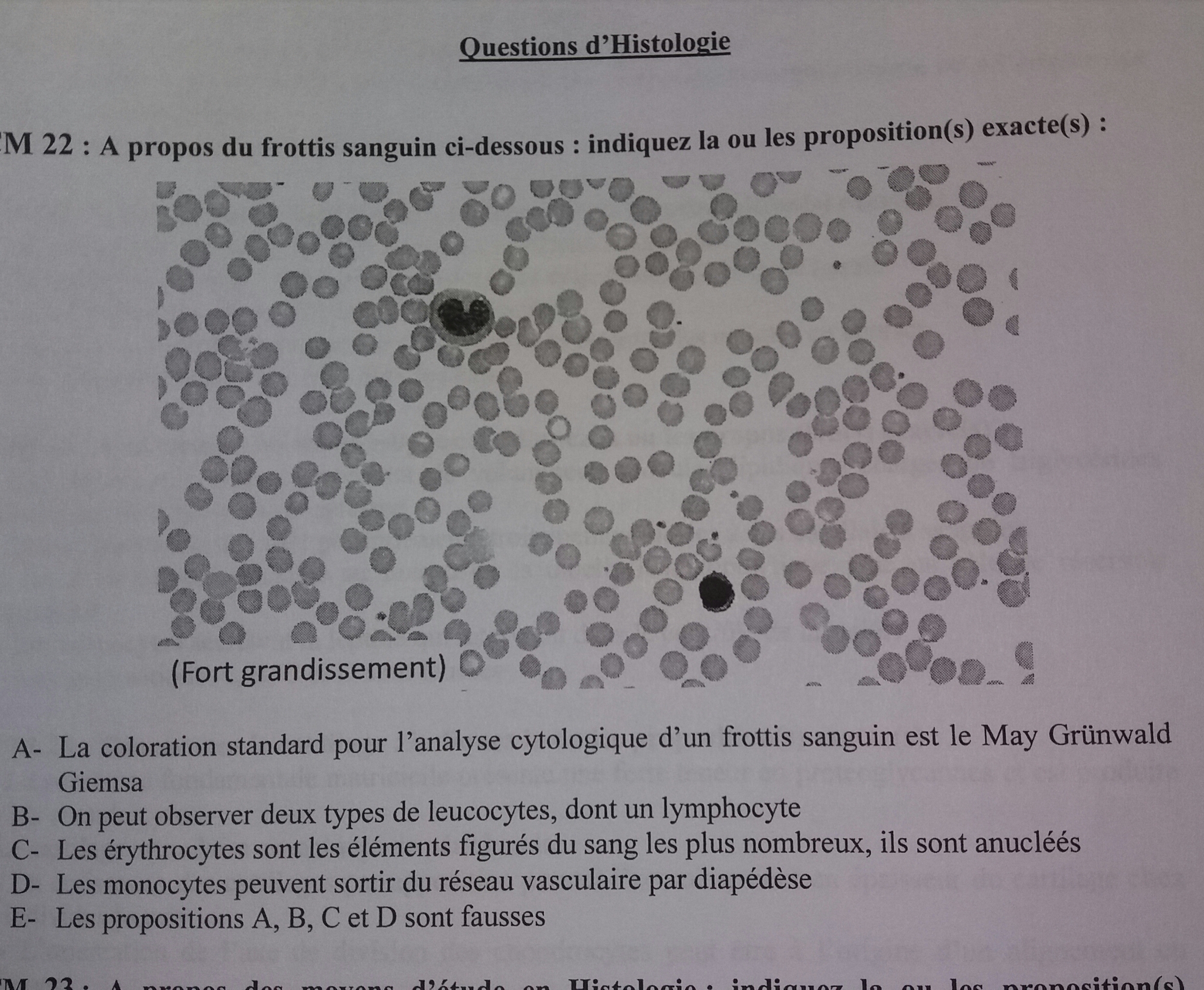 En fait a propos de l'item D: Les monocytes peuvent sortir du réseau vasculaire par diapédèse, bien sûr l'item est vrai; sauf que l'énoncé est A propos du frottis sanguin ci-dessous, hors dans le frottis il y a 1 seul monocyte, du coup j'avais mis l'item faux.. En plus dans l'item B elle distingue bien ce qu'on voit sur la coupe c'est pour ça que j'avais vu un piège :sad2: j'aimerais bien qu'on en parle a la prof :curl-lip: