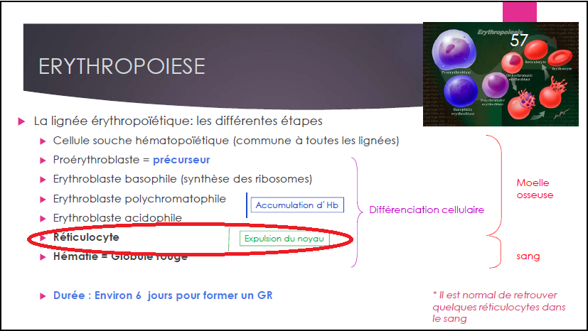 Au sujet de l’erythropoïèse, on dit que le reticulocyte a un noyau et qu’il Devient globule rouge quand il a expulsé son noyau or sur le schéma en dessous c’est au stade précédent (erythroblaste acidophile) qu’il perd son noyau et du coup le reticulocyte en est dépourvu!