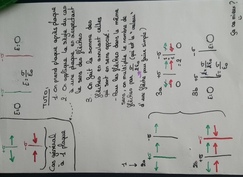 Ici, la plaque (+) est chargée (+2), donc je fais ma méthodo habituelle sauf qu'au lieu de tracer qu'une ligne de flèche j'en tracerai 2 puis j'en reviens à mon étape 3