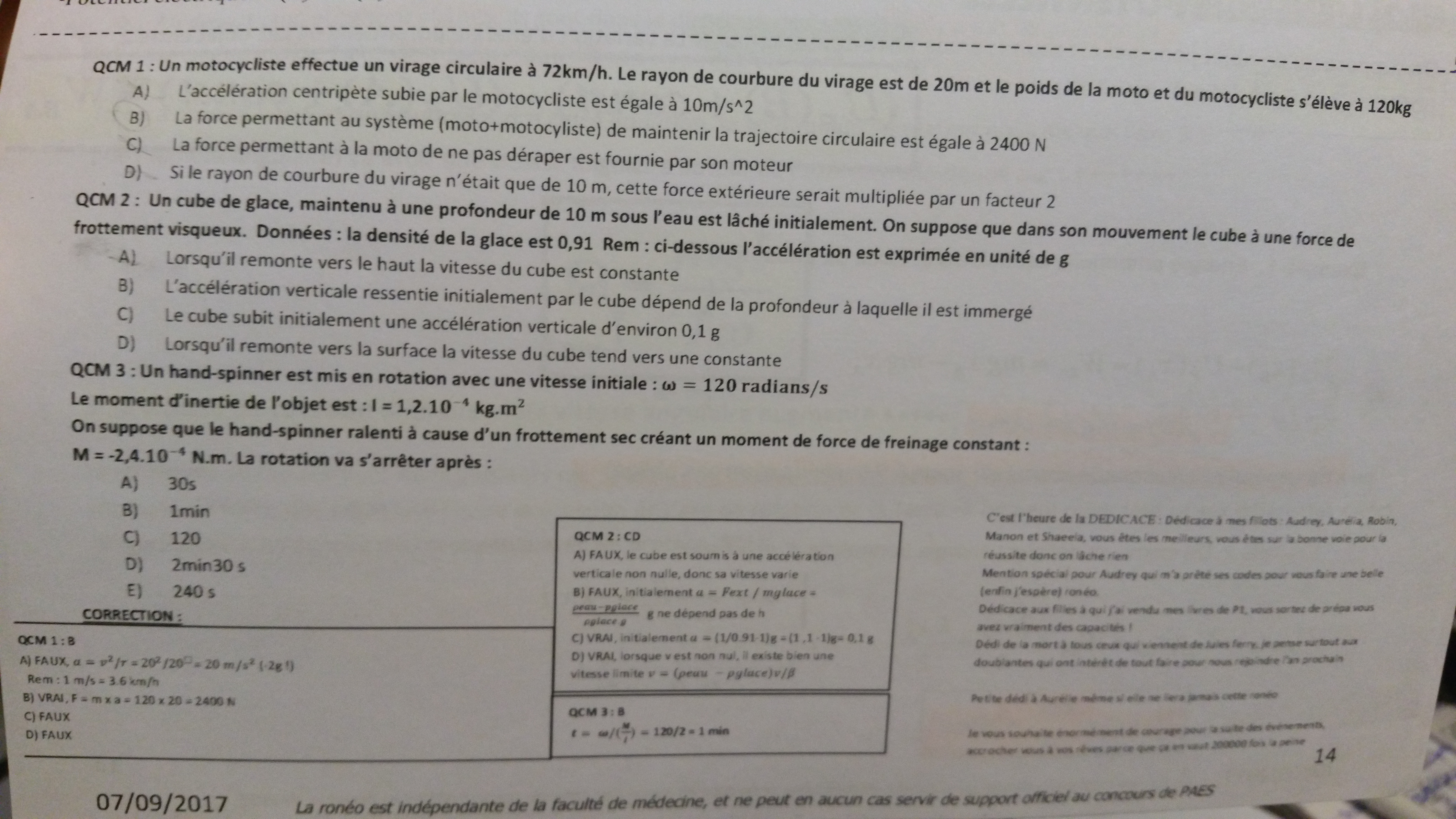 Coucou toujours sur ces fameux QCMs, pourquoi l'item D du 1 est faux ? :p pour moi on divise par deux le r donc on multiplie par 2 l'accélération donc la force extérieure aussi fin je sais pas ... Si quelqu'un peut m'éclairer !!