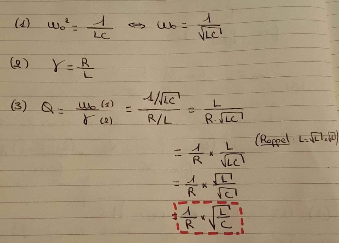 Dans l'exemple du résonateur, je n'arrive pas à retrouver Q =(1/R ).racine (L/C)