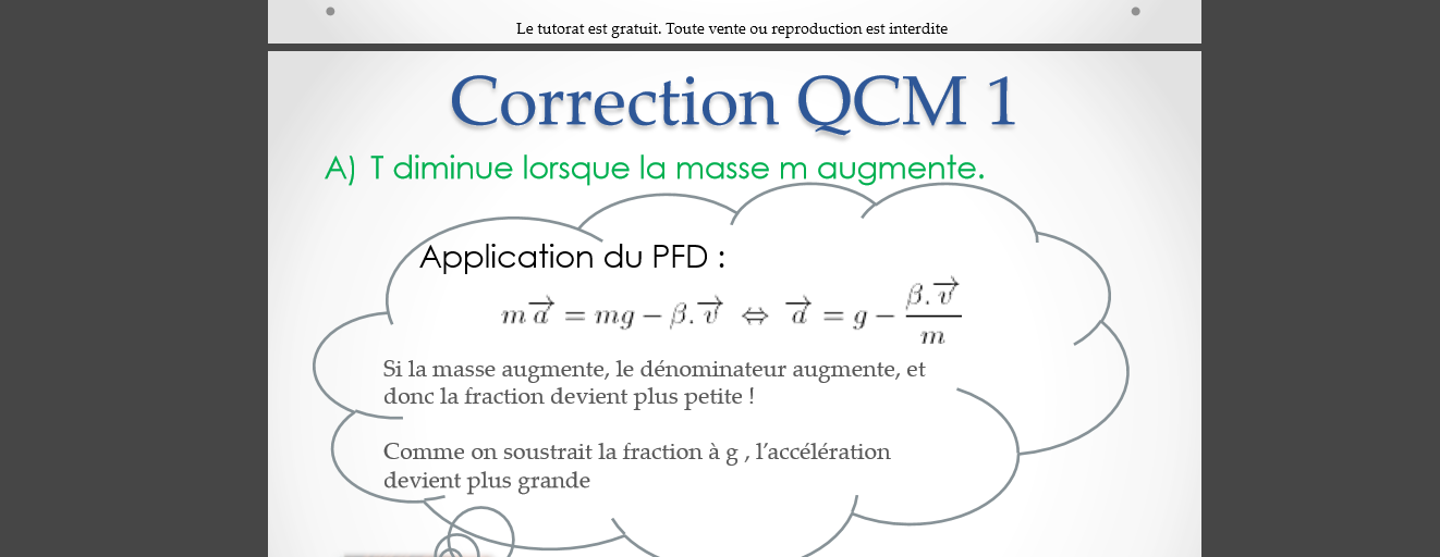 En effet, la présence de forces de frottement implique que l'on aura une accélération (et donc une vitesse et un temps de chute) dépendante de la masse (comme vu dans la correction)