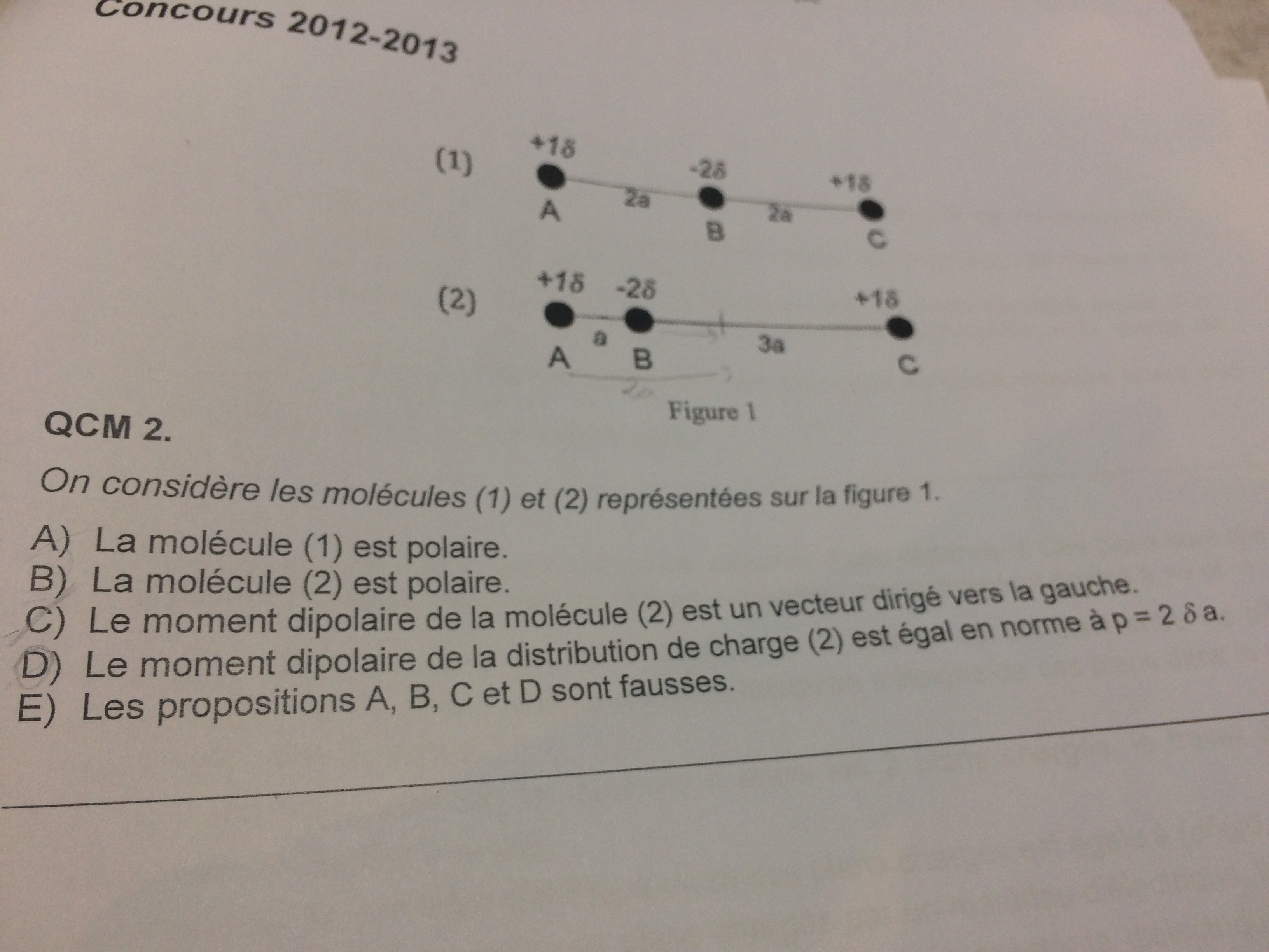 Ta molécule n°2 a 2 charges (+1) et une charge (-2) au milieu : Or pour trouver notre vecteur moment dipolaire, il faut trouver les barycentres de chaque charge (+) et (-)