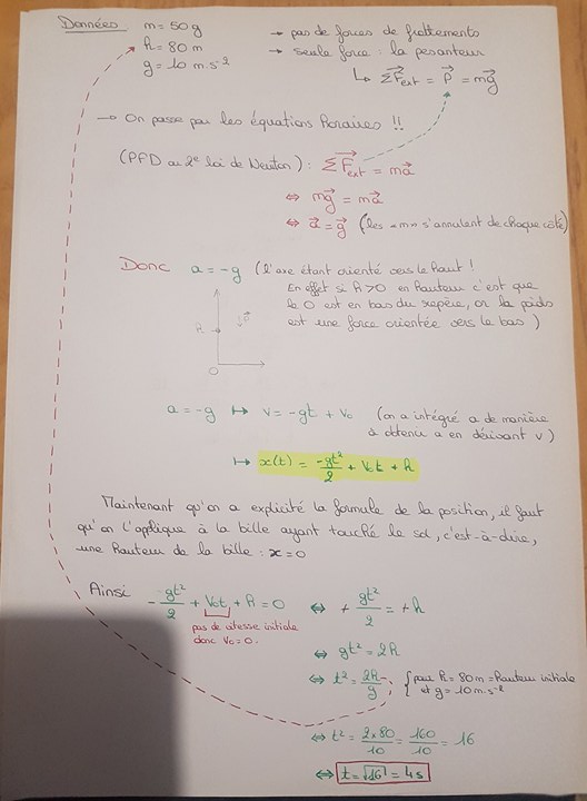 J'arrive pas bien à comprendre comment faire pour trouver à quel moment la bille atteindra le sol? (c'est-à-dire t=4s d'après la correction) ? Si vous pouvez m'éclairer merciiii