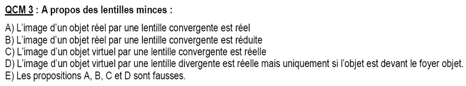 Regarde bien la correction il y a des erreurs, on peut voir que les QCM BCD sont marqués justes et juste en dessous ils marquent qu'il a seulement CD de juste, c'est simplement une faute de frappe ^^ (parce que effectivement l'image d'un objet réel par une lentille convergente est soit réduit (avant 2f) soit agrandie (après 2f, c'est à dire entre 2f et la lentille))