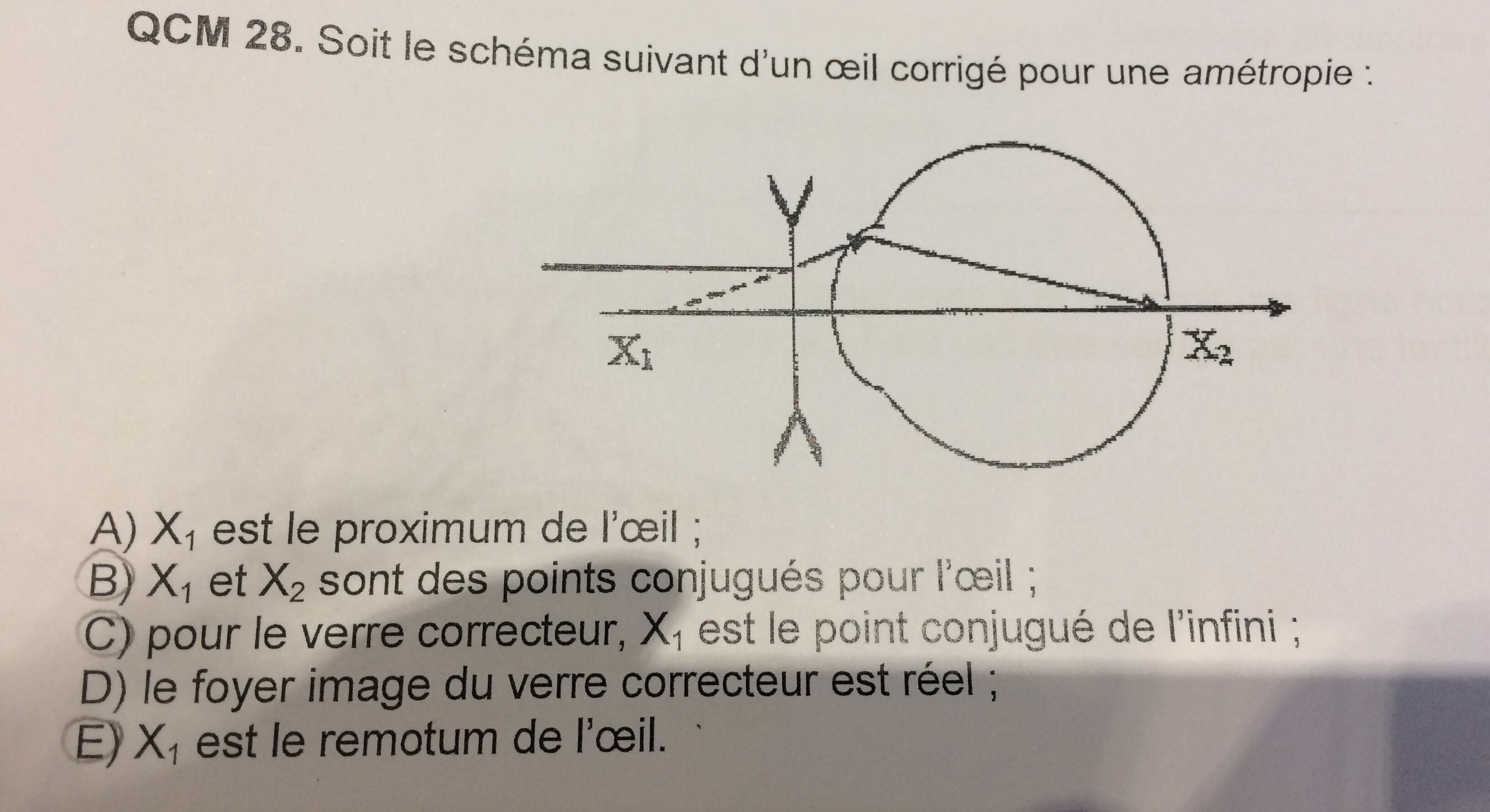 :arrow: Item B: Sans correction le point conjugué de X1 devrait être avant la rétine mais le but de la correction c'est bien de rétablir une vision normale cad que l'image de X1 soit sur le rétine. Donc vrai !