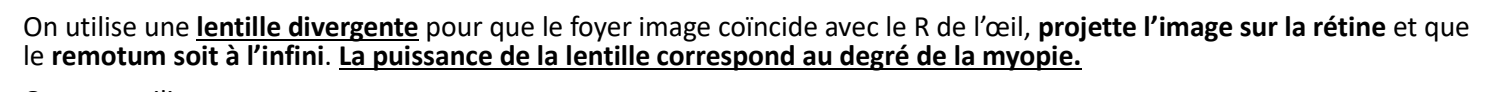 Voici un passage de la ronéo de l'an dernier. On nous énonce très clairement que la lentille va permettre d'avoir une image sur la rétine + de rétablir le remotum à l'infinie. On retrouve donc une vision normale !
