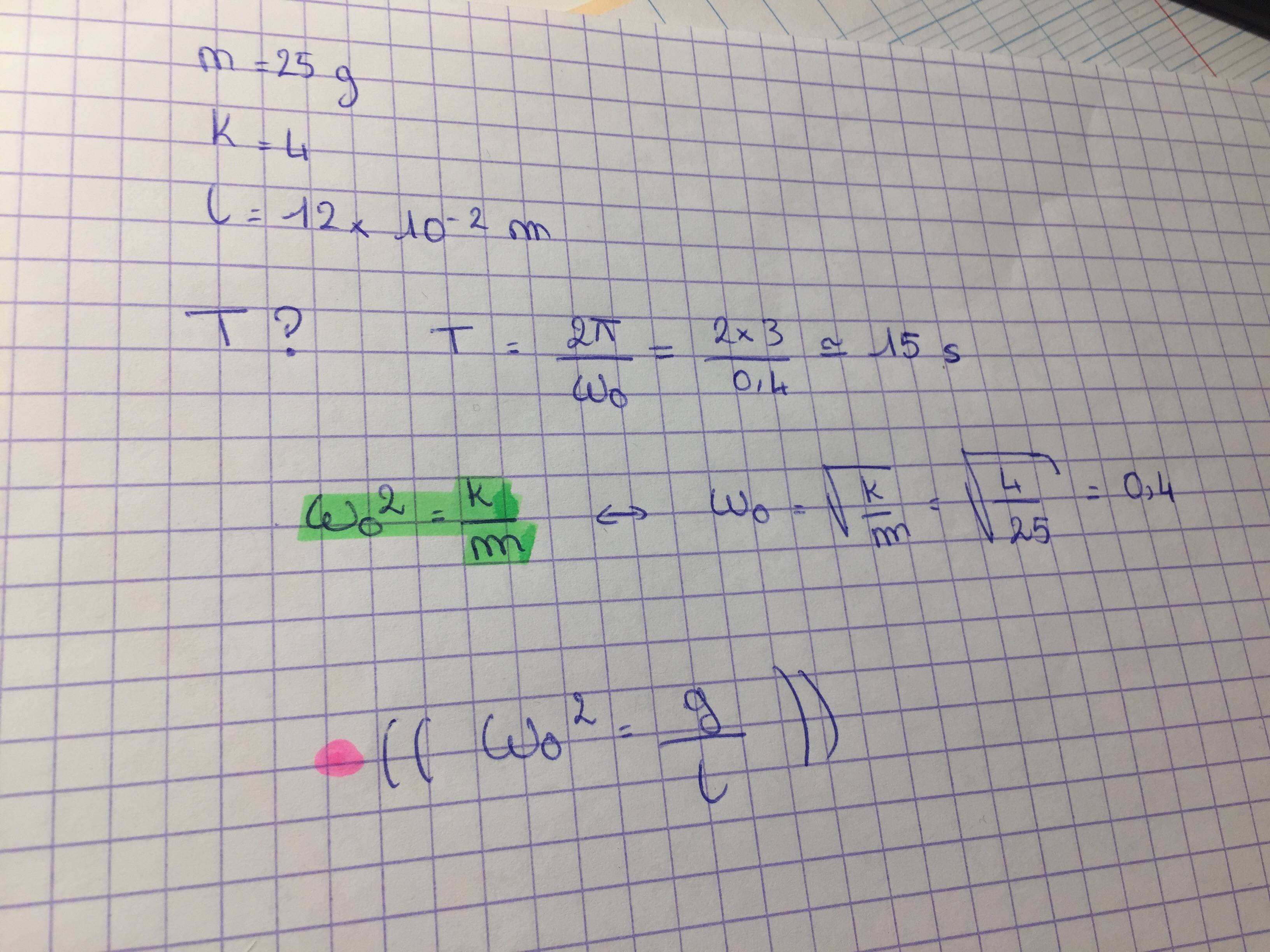 Hello ! Je ne comprends pas pourquoi dans ce qcm on ne le résout pas comme je l’ai fait ?! Pour moi on utilise la formule verte car on est dans le cadre d’une masse liée à un ressort or dans la correction on utilise c’est la rose qui d’après le cours représente une masse ponctuelle suspendu à l’extrémité d’une ficelle ! je vois pas pourquoi on utilise la deuxième formule au lieu de la première en gros !