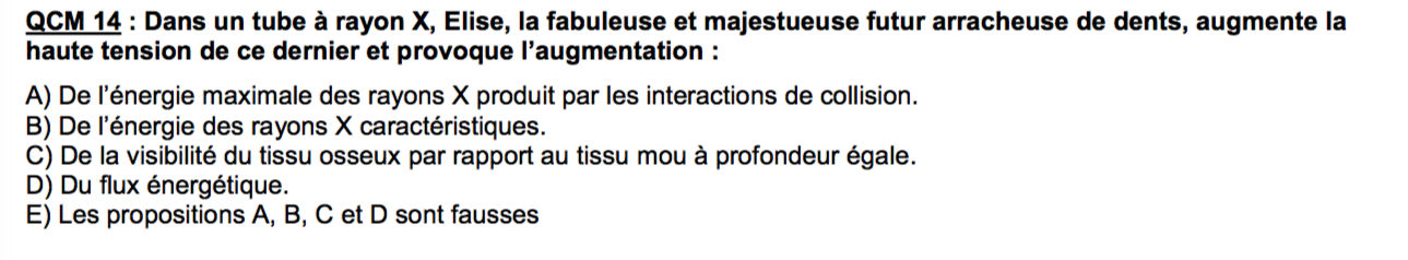 Alors j'ai un peu de mal aussi avec la correction du QCM. Je pense que les tuteurs ont voulu dire que plus on augmentait la haute tension U, plus on aurait d'électrons accélérés dans le tube à RX et plus on aurait de rayons X produits, et donc plus on aurait d'interactions entre les RX et les tissus.
