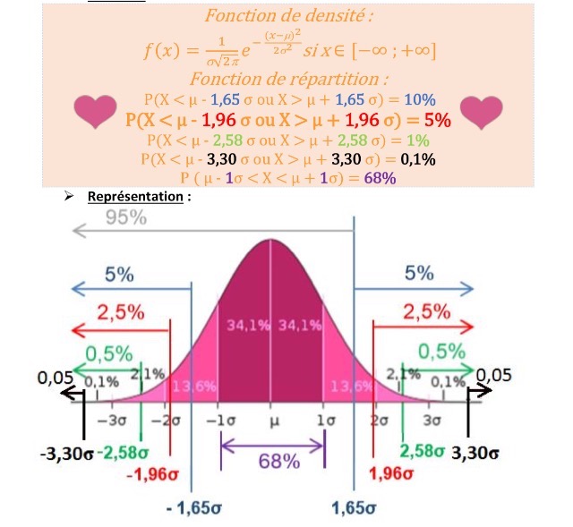 Parce que pour moi, en se basant sur le graphique ça serait plutôt "P(X<mu-1,96sigma ET X>mu1,96sigma) =5%" vu que de chaque côté' c'est égal à 2,5%..?