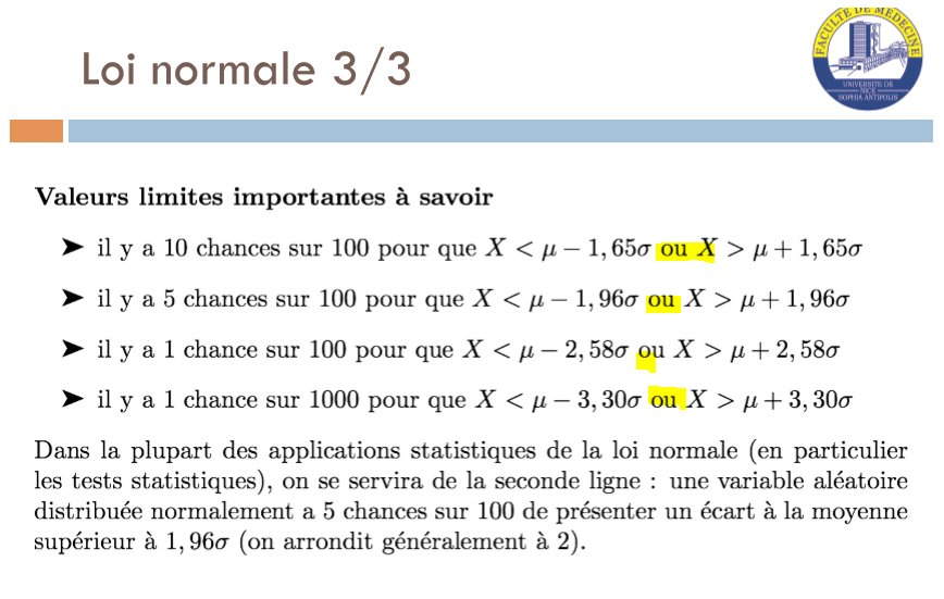 J'ai une petite question sur la loi normale, je ne comprends pas pourquoi on dit "P(X<mu-1,96sigma OU X>mu1,96sigma) =5%"