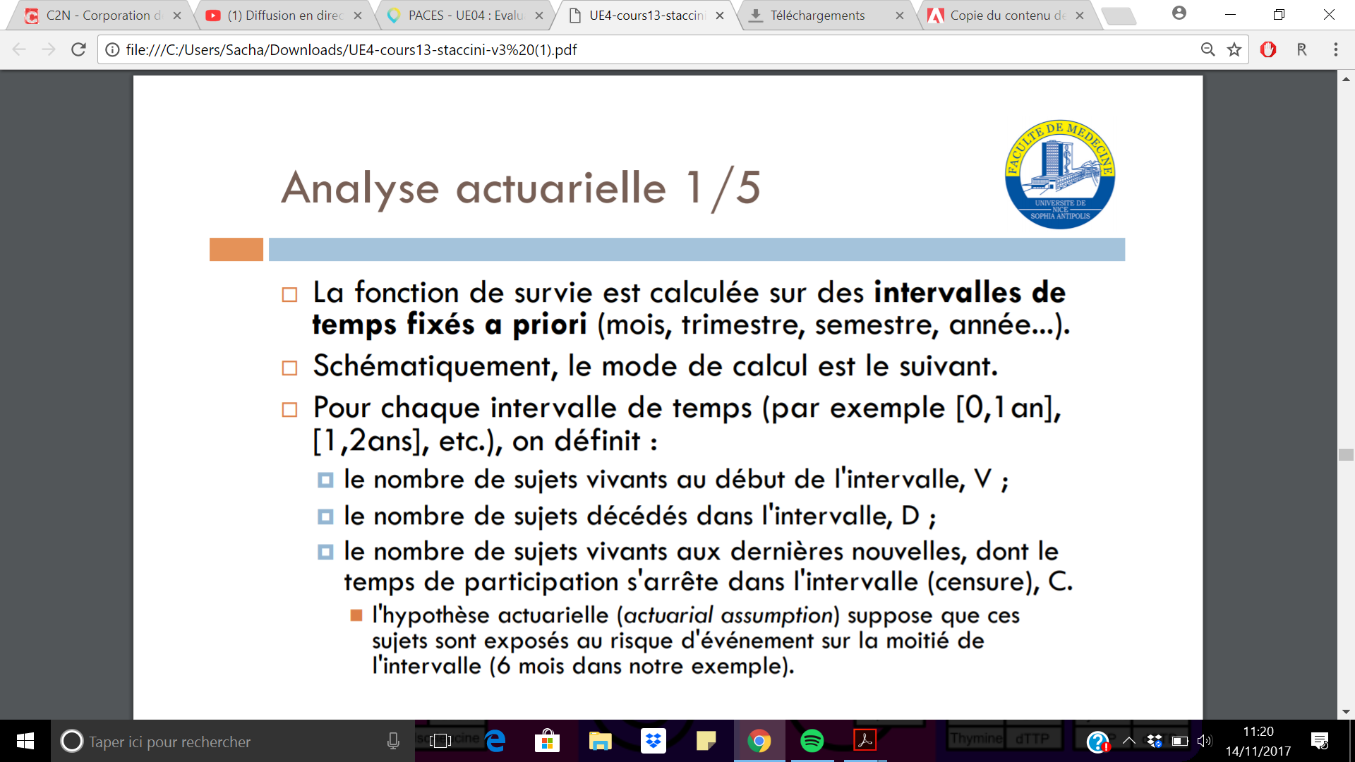 En fait dans l'analyse actuarielle, on fixe les intervalles de temps à l'avance. Du coup, on va étudier le nombre d'évènement sur l'intervalle [0 ; 8 mois], [8 ; 16 mois] par exemple ... et cela va poser un problème ! Parce que si un sujet meurt au début de l'intervalle [0 ; 8 mois], ça sera compté pareil dans les résultats qu'un autre sujet qui serait mort à la fin du même intervalle, alors qu'il y a 8 mois de différence entre les deux !! C'est un des défauts de cette analyse, il y a comme une perte de précision .. (c'est pour ça que c'est pour les grandes cohortes, car le nombre important de sujets réduit cette imprécision)