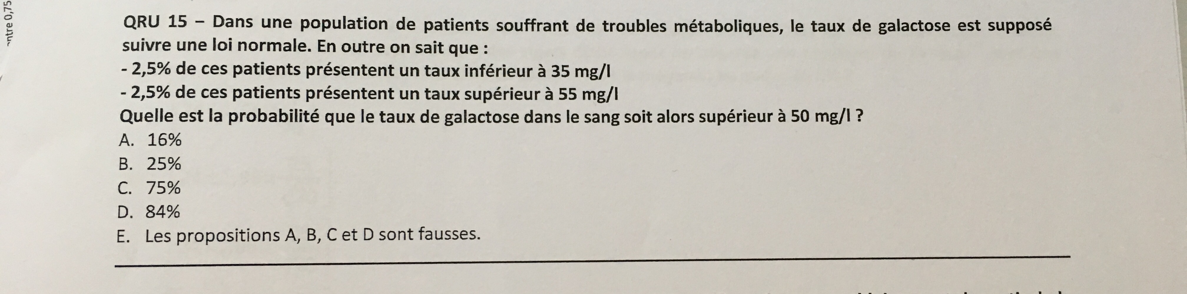 À partir de la, tu peux facilement calculer : 50 mg/L c'est moyenne + 1 écart-type, or 68% de la population est comprise dans l'intervalle [moyenne +/- 1 écart-type]. On a donc 32% de la population en dehors de cet intervalle, soit 16% en-dessous de 40 mg/L et 16% au-dessus de 50 mg/L.