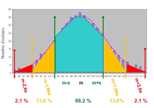 Pcq en soit quand on a par exemple m-2s, m+2s, ça veut dire que l'intervalle contient 95% des valeurs, et 2,5% sont exclues de chq côté, mais est-ce qu'il y a une application pour le 13,6 ? (déso question un peu bizarre mdr)