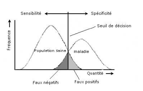 (de même si on déplace la barre verticale vers la gauche : le seuil diminue = spécificité diminue = sensibilité augmente (sélectionner tous les malades aux risque d'en diagnostiquer à tors) = Faux positifs augmentent (le test est plus sensible donc il en diagnostique trop de positif, il n'est pas assez spécifique de la maladie) = Faux négatifs diminue (car le nombre de négatifs tout court diminue car le test donne plus de positifs)