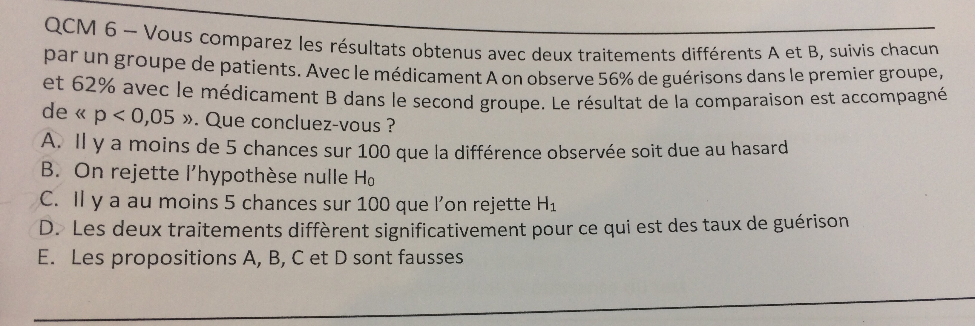 Il aurait fallu : "Il y a moins de 5 chances sur 100 que l'on rejette H0"