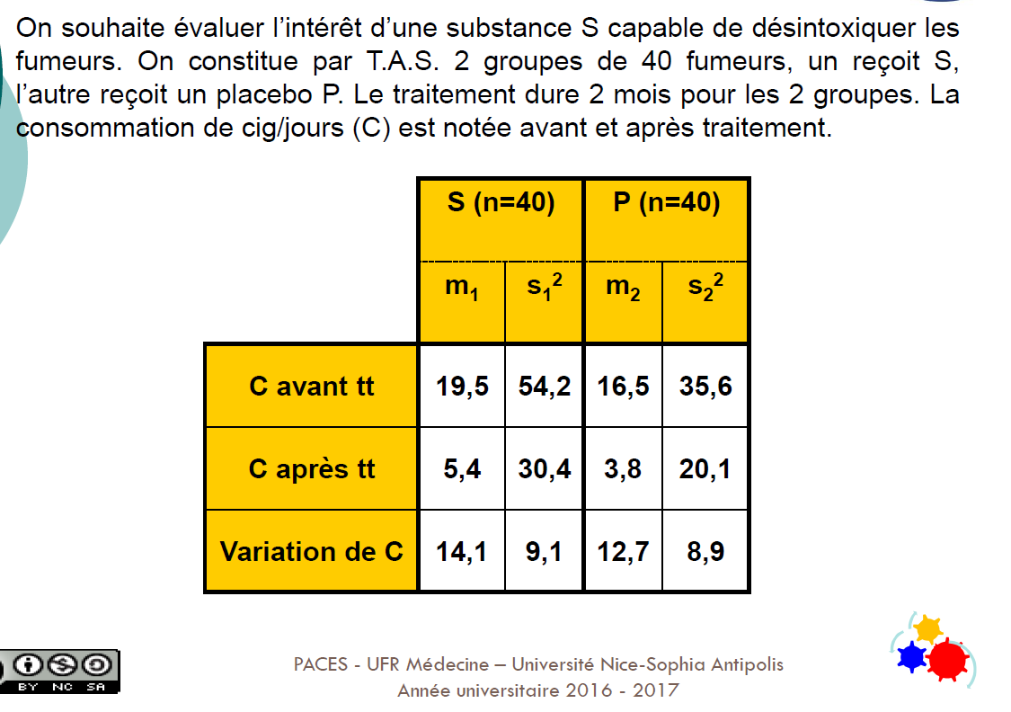 On souhaite évaluer l'intérêt d'une substance S capable d'aider les fumeurs à diminuer leur consommation de cigarettes. On constitue par TAS 2 groupes de 40 fumeurs. L'un reçoit S et l'autre reçoit un placébo P. Le traitement dure 2 mois pour les 2 groupes. La consommation de cigarettes par jour (C) est notée avant et après traitement. Pour chercher un éventuel effet placébo :