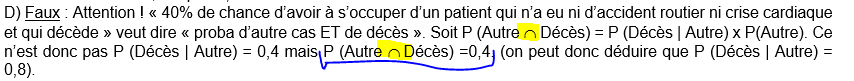 Cependant la phrase explique bien pour moi que P(Décès/Autre)=0,4 : on a 40% de chances qu'un patient décède sachant qu'il a eut ni accident routier ni crise cardiaque.