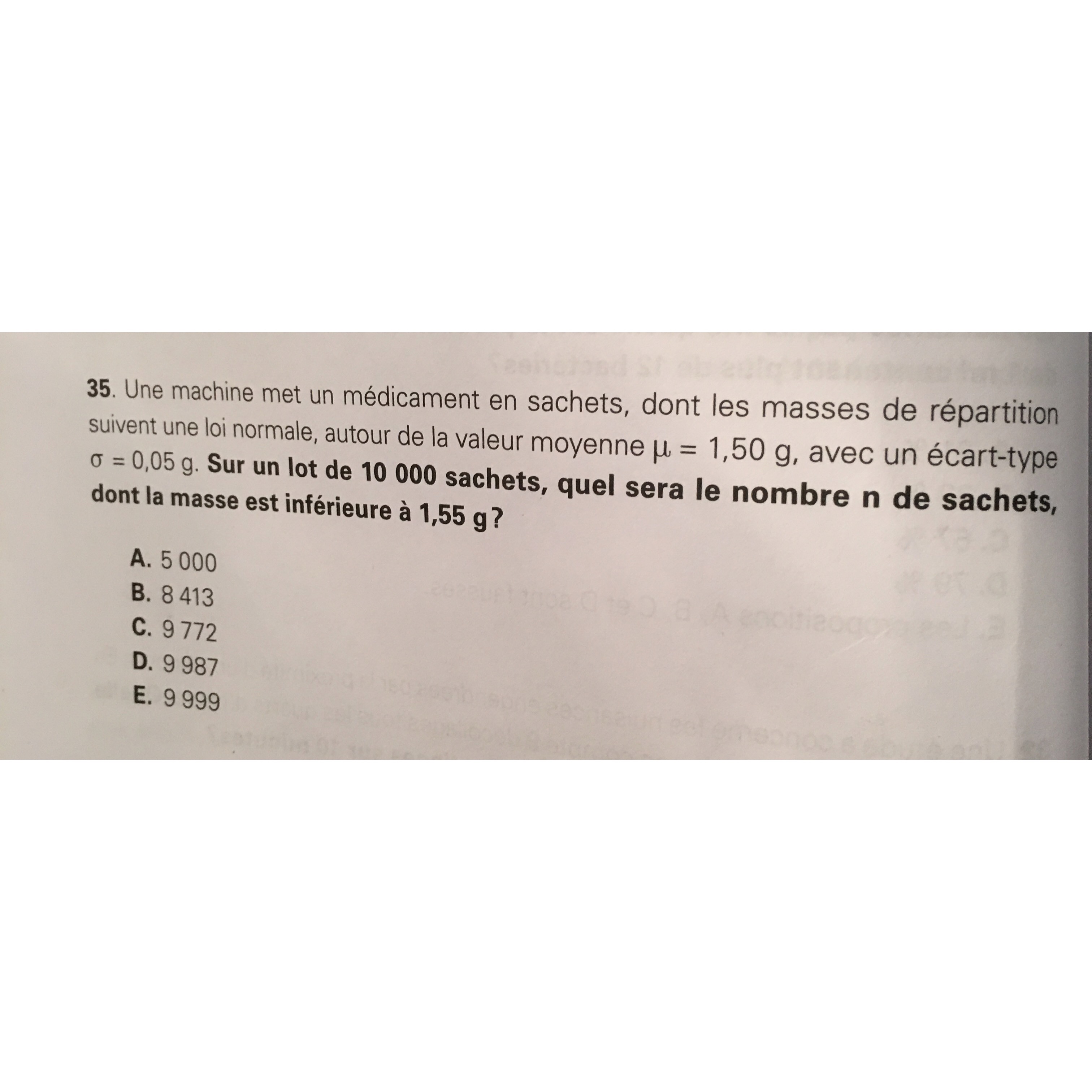 On a donc 84% environ de l'échantillon qui est inférieur à 1,55 soit 84% de 10000= 8400. :arrow: Réponse B