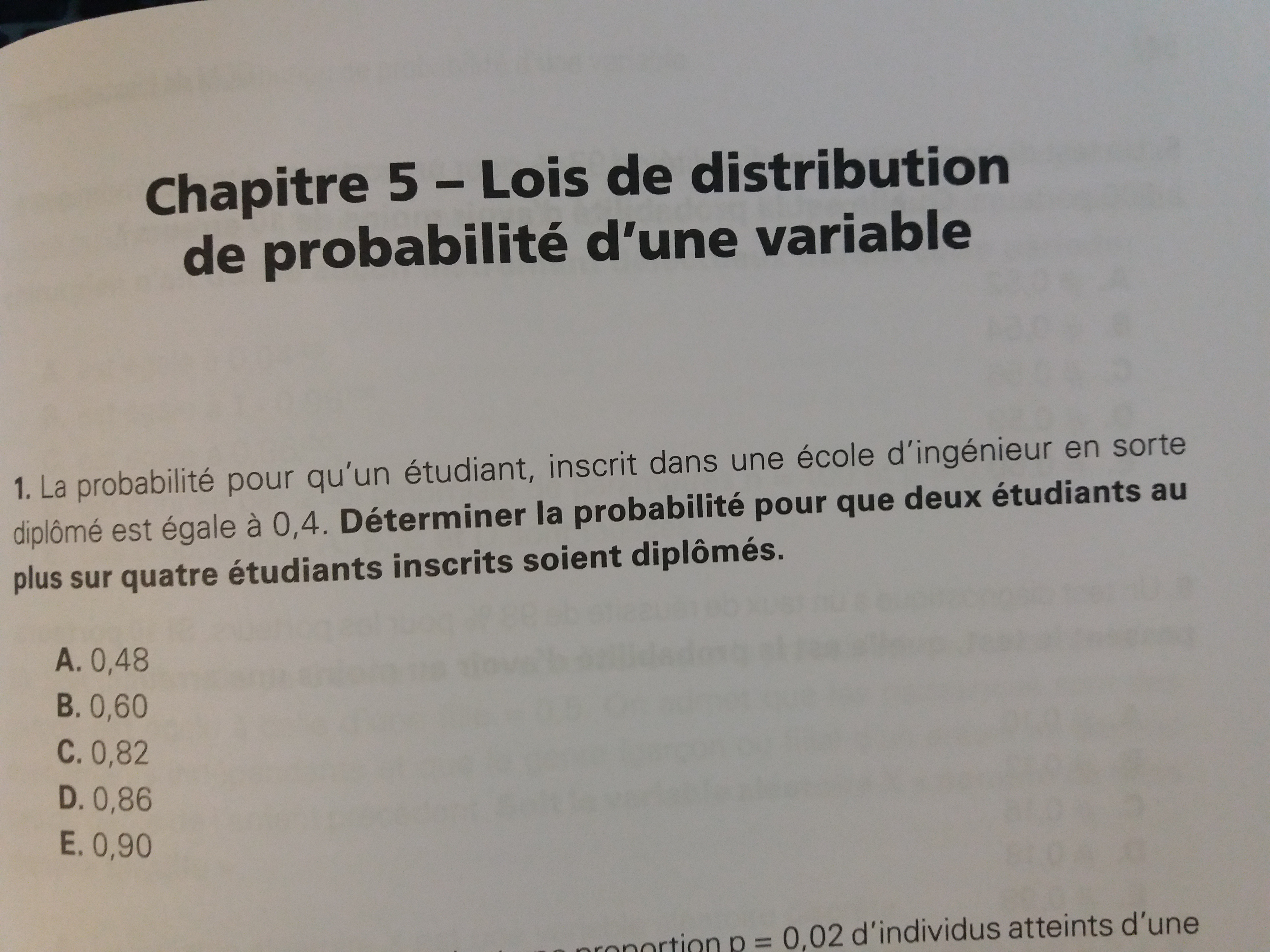 Comme tu peux le voir, j'ai additionné la probabilité de chacune des possibilités (0 étudiant diplômé, 1 étudiant diplômé et 2 étudiants diplômés) et je trouve 0,82
