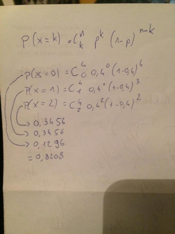 Ainsi, pour trouver la bonne réponse, il faut faire cette loi binomiale avec k = 0, k = 1 et k = 2 !