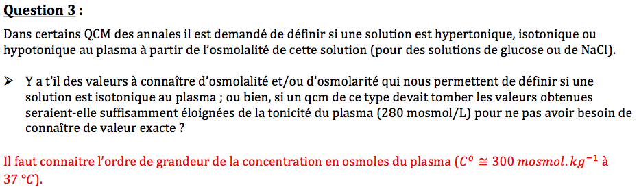J'avais déjà posé une question sur le forum à ce propos mais du coup est-ce que ce serait possible, la prochaine fois que vous envoyez des questions au prof, de demander au Pr. Darcourt à partir de quelle valeur il considère qu'une solution est hypotonique ou hypertonique au plasma svp? Par exemple, est-ce que 290 mosmol/kg c'est assez inférieur à 300 pour considérer cette solution comme hypotonique au plasma?