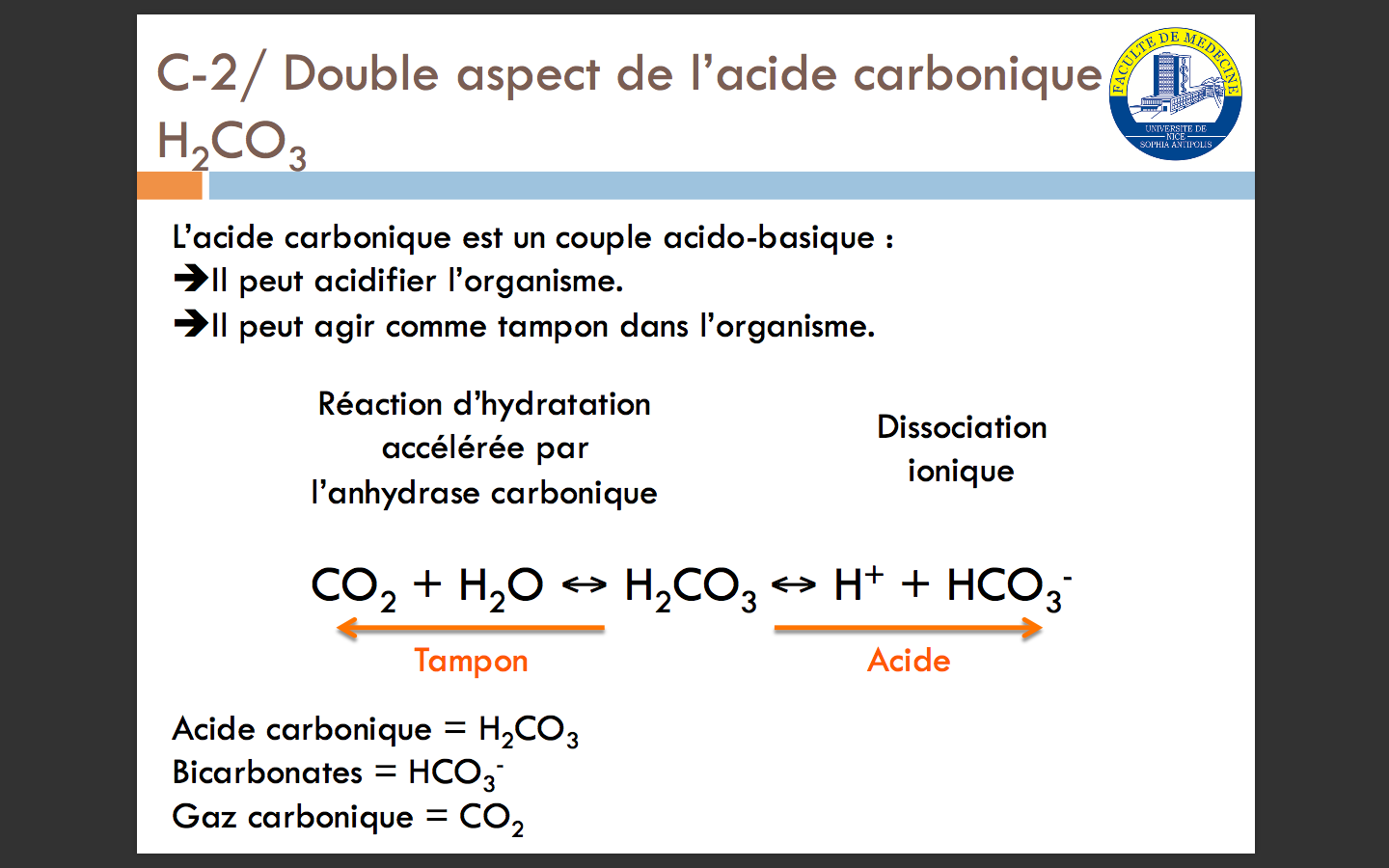 Je lui ai demandé si un item "les tampons sont capables de libérer des protons" serait à compter vrai, il m'a répondu qu'il ne poserai pas ce genre d'item ! En soit il ne m'a pas répondu mais il m'a expliqué qu'en physiologie, les bicarbonates à cause de leur pKa captent des protons pour limiter les variations de pH du milieux intérieur !