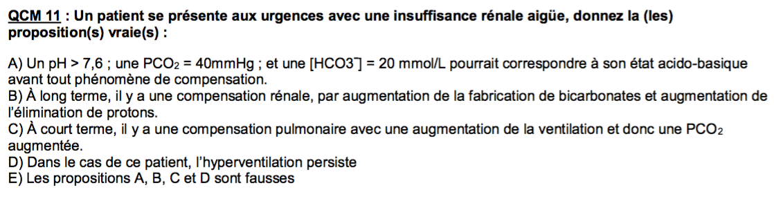 Salut, en cas d'insuffisance rénale il va se passer plusieurs choses tout d'abord le débit de filtration glomérulaire diminue, il y a donc une accumulation d'acides fixes dans l'organisme, de plus les reins vont être moins capables de produire des bicarbonates, on se retrouve donc en acidose métabolique (item A faux). Pour compenser cette acidose métabolique la fréquence ventilation va augmenter et ainsi favoriser la consommation de protons et de bicarbonates , la PCO2 diminue (item C) faux. Cette adaptation ventillatoire (hyperventilation) persiste jusqu'à ce que la cause de l'acidose s'arrête, donc on peut parler d'hyperventilation persistante (jusqu'au traitement de la cause si c'est possible) donc item D vrai et pour la B comme ce sont les reins qui disfonctionnent (de manière très importante généralement en insuffisance rénale aigue) ils ne vont pas pouvoir compenser la situation donc l'item B est faux !