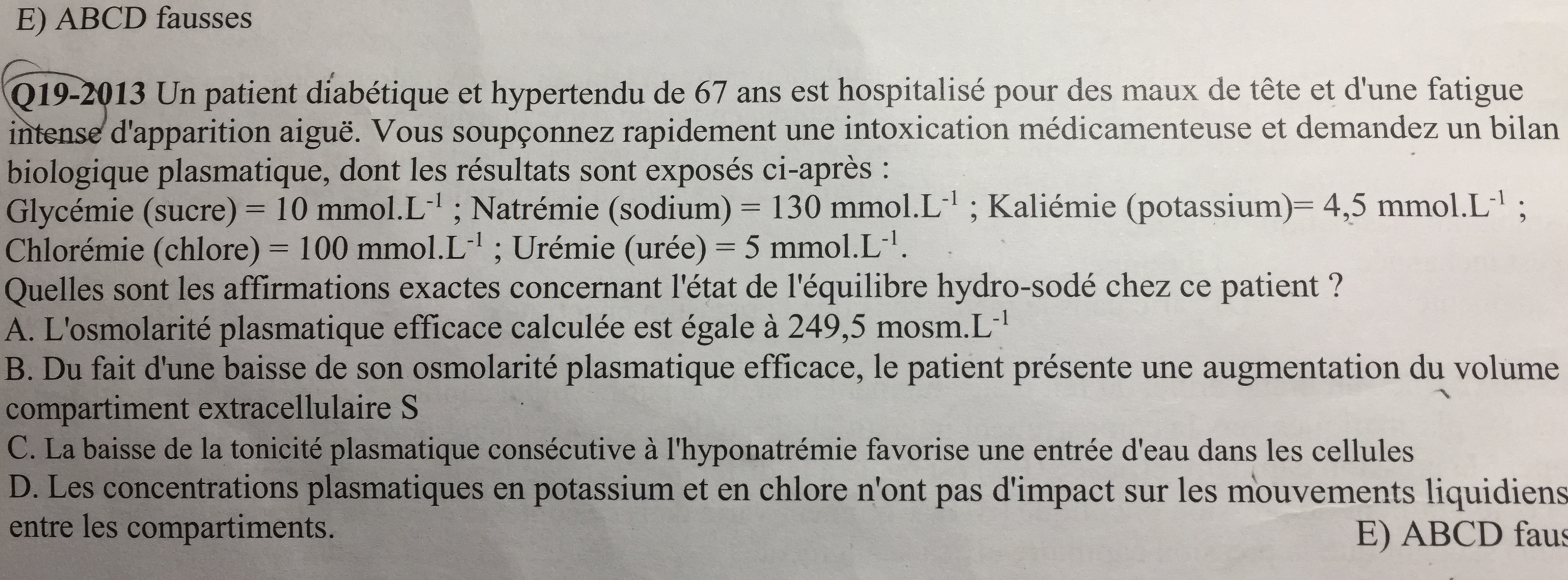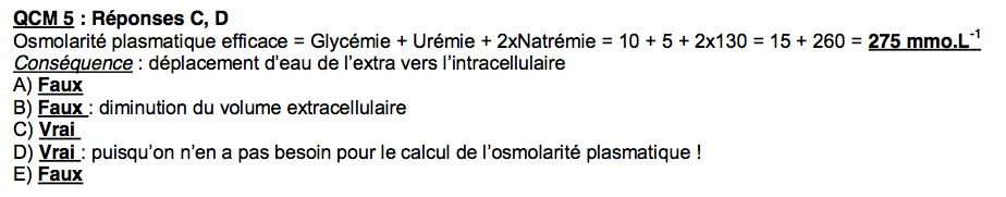 Outre le calcul de l'item A qui est hors programme. On a un compartiment extra cellulaire qui est hypotonique donc l'eau va aller du milieu extra cellulaire vers le milieu intra cellulaire (réponse C vrai et réponse B fausse). De plus le potassium et le chlore ne sont pas des osmoles efficaces donc l'item D est vrai