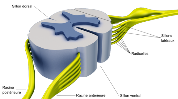 Regarde par rapport à ce schéma: des sillons collatéraux de la moelle proviennent des radicelles (ce sont les fines branches à la forme de dents d'une fourchette) qui vont s'unir formant une racine (c'est la grosse branches après les fines) puis les racines antérieures et postérieures vont s'unir pour former le nerf spinal (qu'on voit tout à droite) et ensuite après ce nerf ça va se diviser en 2 rameaux (un postérieur et un antérieur qu'on ne voit pas sur le schéma)
